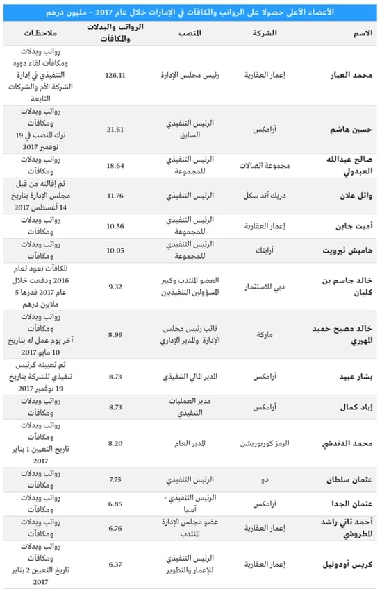 احتل 30 عضوًا في شركات الإمارات مراتب متقدمة في قائمة المديرين العرب أصحاب أعلى رواتب في 2017.