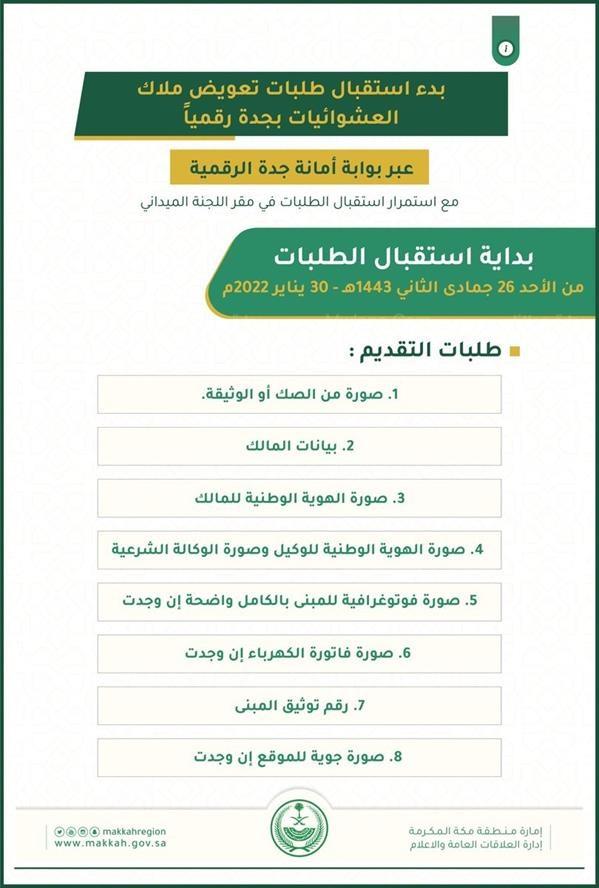 وترسل المستندات من خلال خدمة استقبال طلبات تعويض إزالة المناطق العشوائية عبر بوابة أمانة جدة الرقمية.