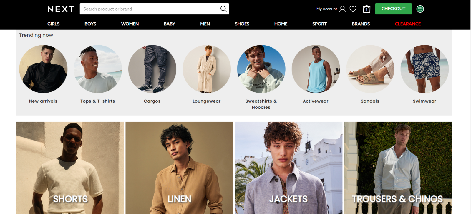 بالدخول إلى موقع Next ستجد قسم الملابس الرجالية ينتصف بقية الأقسام، وبالدخول إليه ستجد أقسامًا فرعية لكل ما قد تتمناه. ضمن هذه الأقسام يوجد قسم "ملابس المناسبات"، والذي بداخله ستجد الكثير من الأزياء المناسبة للعيد. وإذا أردت زيًا مُحددًا، فيمكنك البحث عنه، إذ ستجد كل شيء بداية من المعاطف وتيشيرتات البولو والبنطلونات، وحتى الأحذية والإكسسوارات وغيرهما. ويضم الموقع الكثير من "البراندات" المعروفة مثل Adidas وConverse بأسعار مناسبة.