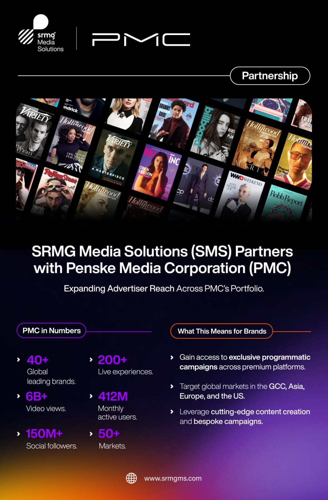 أعلنت SRMG للحلول الإعلامية (SMS) عن إبرامها شراكة استراتيجية مع شركة بنسكي ميديا، تهدف إلى تعزيز حضور المعلنين في المنطقة على نطاق عالمي، عبر الاستفادة من محفظة PMC، التي تضمّ مجموعةً من العلامات التجارية العالمية الرائدة.