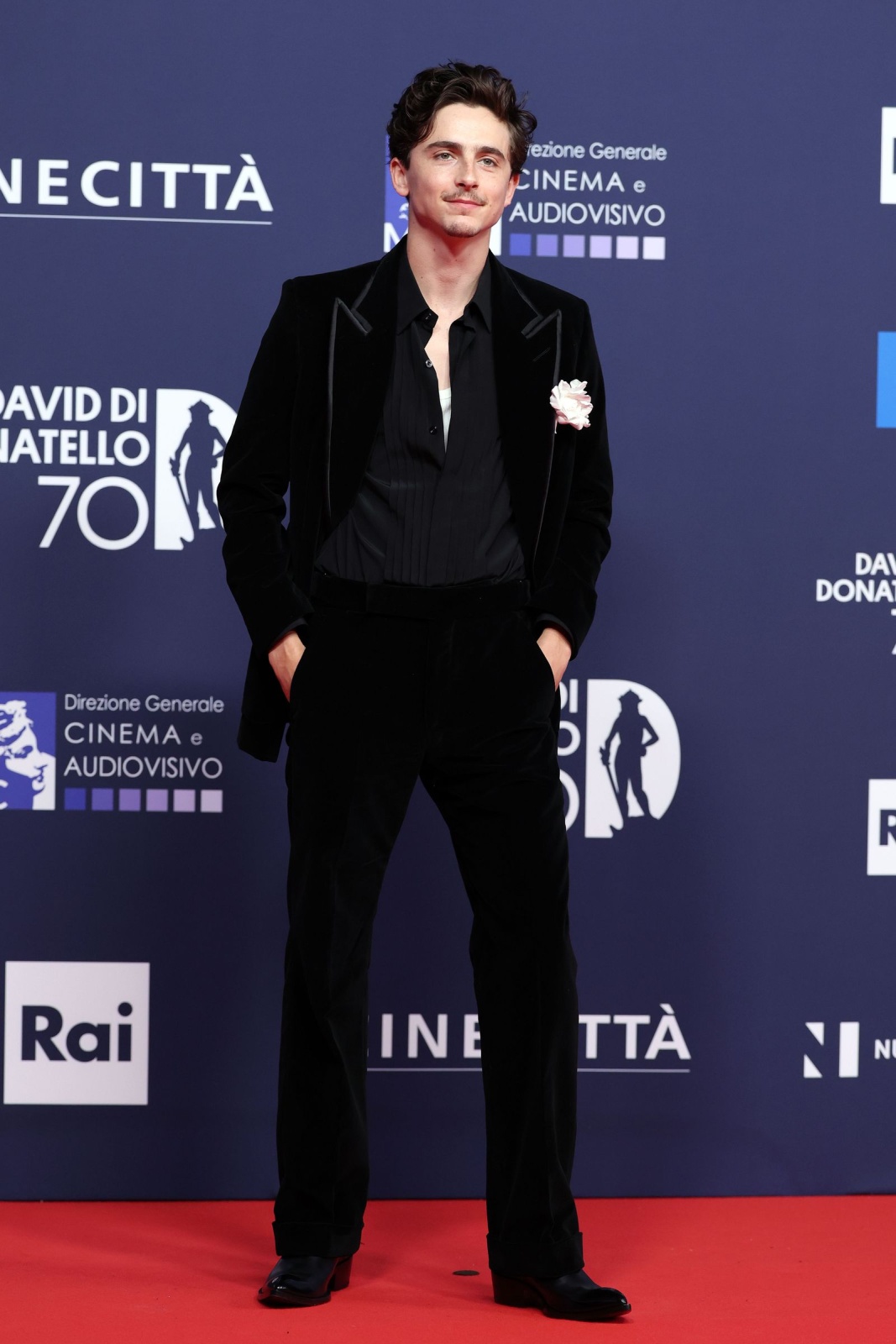 في حفل جوائز David di Donatello السبعين في روما، جذب تيموثي شالاميت الأنظار بإطلالة أنيقة وغير تقليدية، حيث ارتدى جاكيت بليزر أسود من المخمل، بتصميم بسيط وياقة مدببة، مما أضاف إليه لمسة من الأناقة.