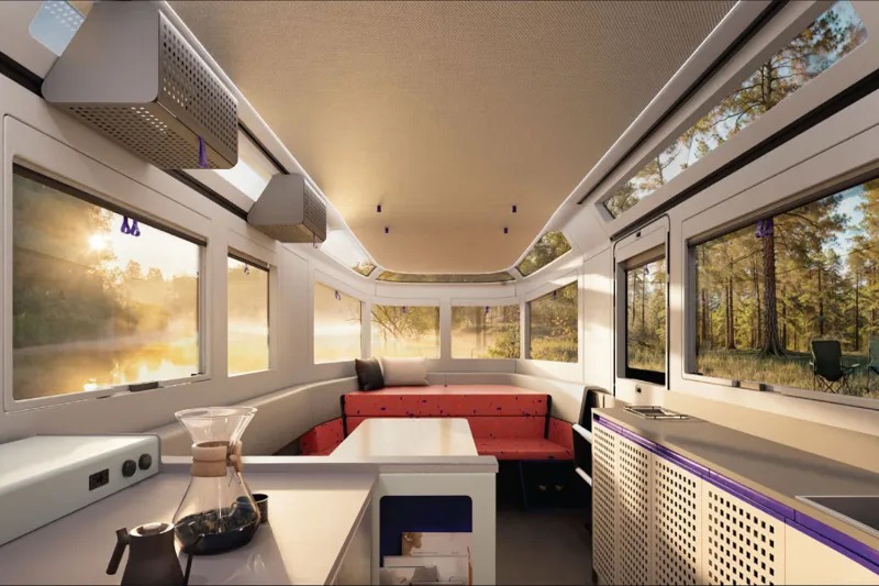 التصميم الداخلي متوفر بلونيين أنيقين: Timberline (الخشبي الدافئ) وDuskHorizon (الرمادي العصري)، وتحتوي المقصورة على أكثر من 18 نافذة وسقف زجاجي، ما يجعلها واحدة من أكثر المقطورات تهويةً وإشراقًا في فئتها.