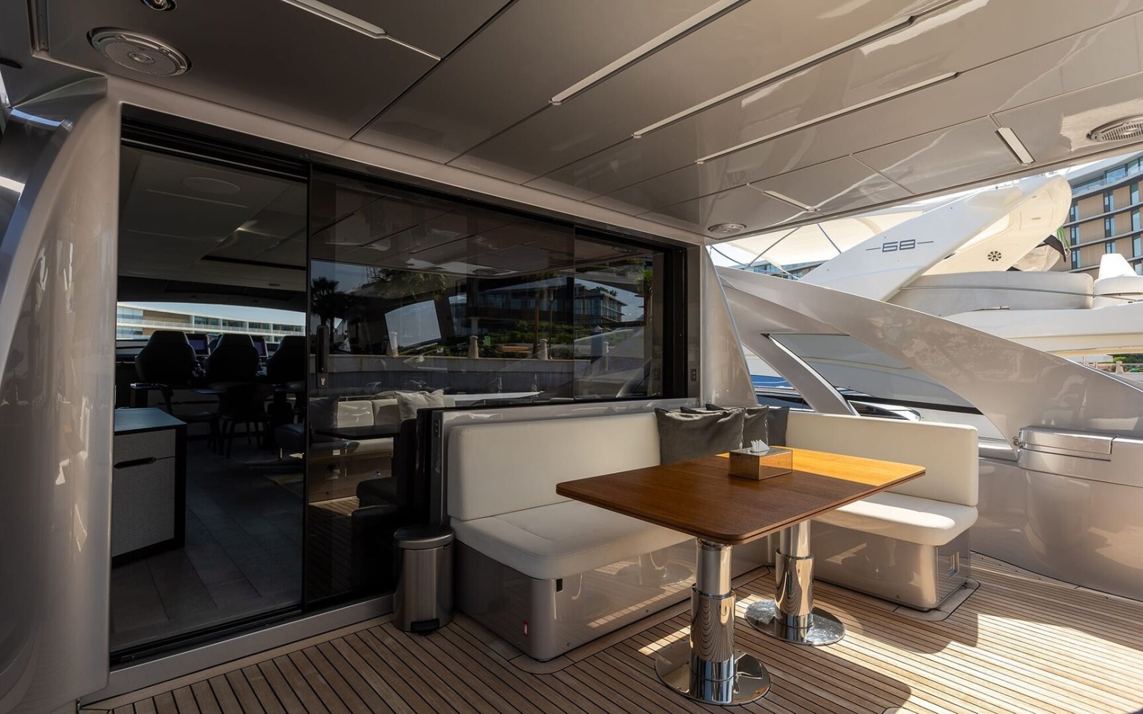 ويمتد الترفيه إلى المساحات الخارجية، حيث يمكن الاستمتاع بالجلوس في مؤخرة اليخت أو فوق السطح الطائر (Flybridge)، وكذلك الاستلقاء على وسائد الشمس الفسيحة في المقدمة.