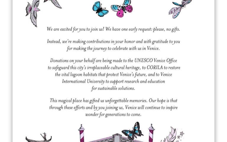 وجاء في الدعوة: "نحن متحمسون لانضمامكم إلينا"! وأضافت: "لدينا طلب مبكر: من فضلكم، لا هدايا. بدلاً من ذلك، نحن نقدم تبرعات نيابة عنكم وبامتنان لكم، احتفالًا بوجودكم معنا في البندقية".