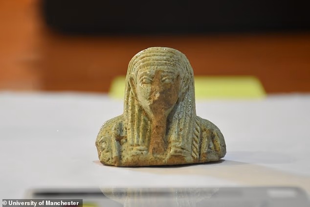 كما عثر الباحثون على تمثال جنائزي صغير من الفيانس الأخضر (أوشبتي)، ولوح حجري يحمل نقوشًا للإله حَربوقراط ورموزًا وقائية.