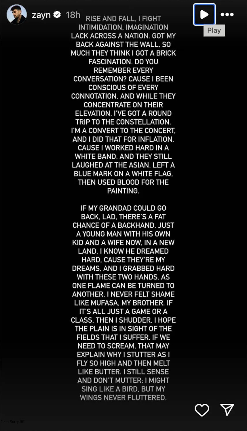 وفي منشور حديث على إنستغرام يوم السبت 5 يوليو، شارك مالك البالغ من العمر 32 عامًا مقطعًا صوتيًا من أغنيته المرتقبة "Fuchsia Sea"، مستعرضًا أبياتًا شعرية تحمل رسائل مشفّرة، لكن ذات دلالة واضحة.