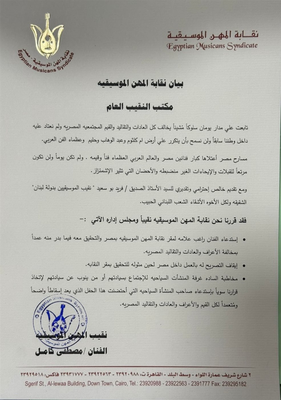 وعبّر عن احترامه الكامل لضيوف مصر والجمهور المصري، قائلًا إن نقابة المهن الموسيقية هي بيته الثاني، وأنه سيحضر شخصيًا للقاء مصطفى كامل.