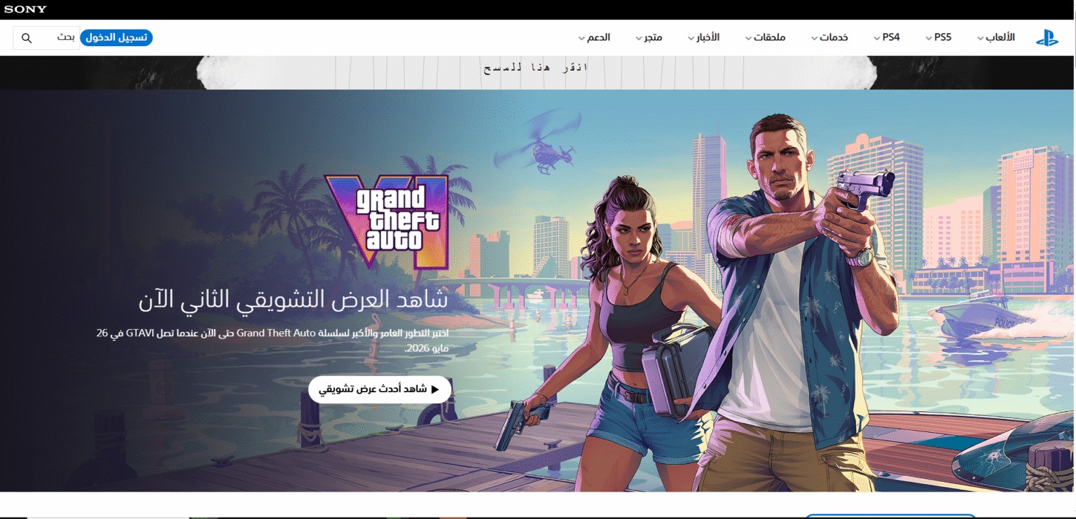 في مفاجأة مثيرة، تم رصد لعبة GTA 6 على متجر بلايستيشن السعودية بنسخة المتصفح، حيث ظهرت في الصفحة الرئيسية مع وصف باللغة العربية يؤكد صدورها في 26 مايو 2026. رغم أن صفحة اللعبة لم تُفتح بعد (ظهرت كـ"404 Error")، إلا أن وجودها على المتجر مع وصف عربي يُعد بادرة واعدة بشأن فسحها رسميًا في الشرق الأوسط.