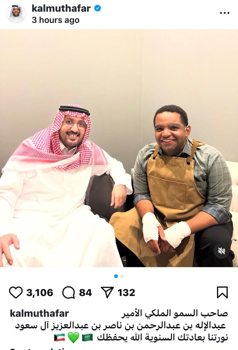 ونشر المظفر عبر حسابه على إنستغرام صورة تجمعه بالأمير عبدالإله بن عبدالرحمن بن ناصر بن عبدالعزيز، أرفقها بتعليق قال فيه: "نورتنا بعادتك السنوية، الله يحفظك".