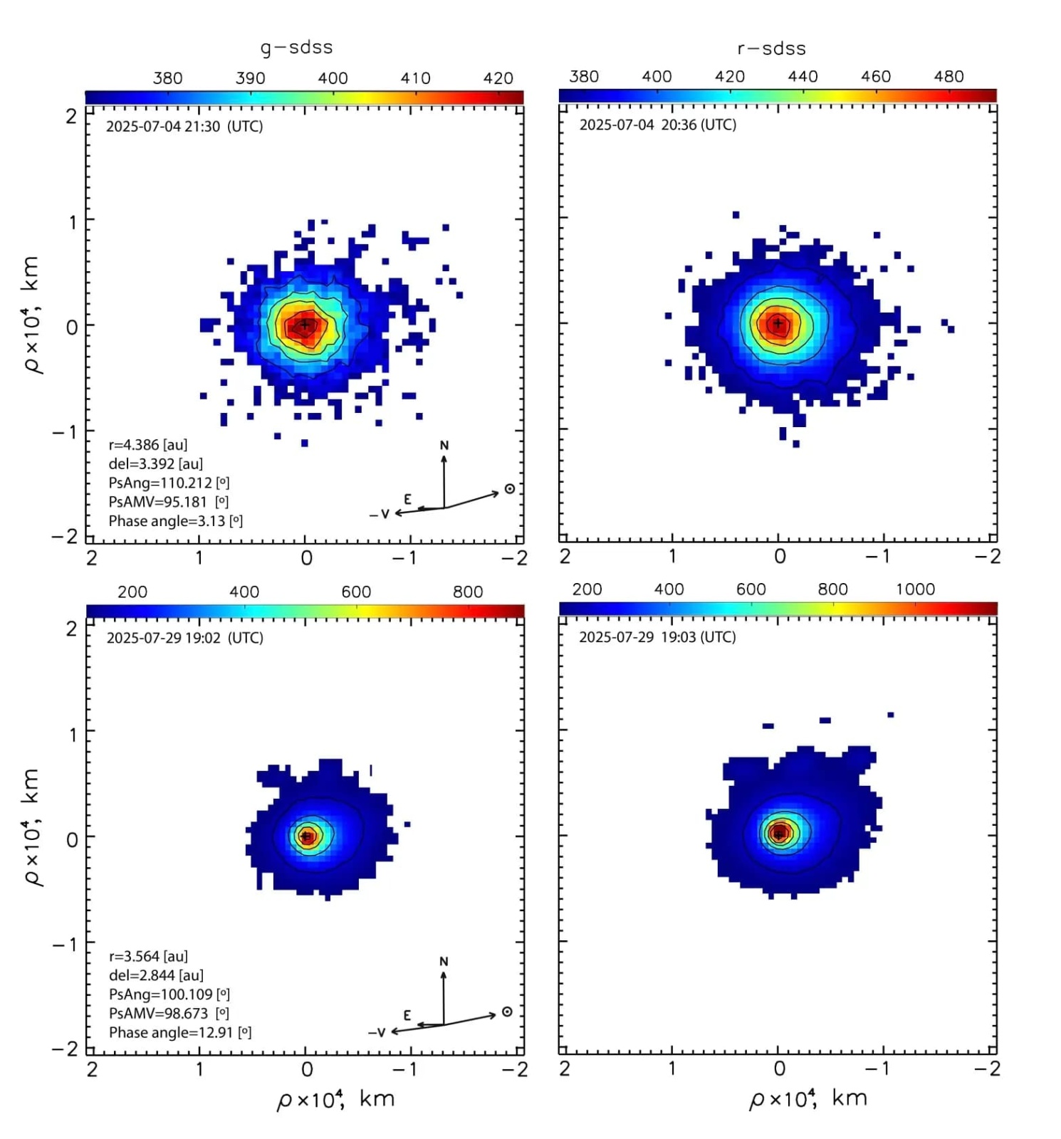 كما أكد أن القياسات الطيفية من عدة مراصد لم تكشف أي آثار لغازات شائعة في المذنبات مثل ثاني أكسيد الكربون أو السيانيد، و"بدلاً من ذلك، أظهرت الصور ألوانًا تميل إلى الاحمرار، قد تكون نتيجة غبار أو مركبات عضوية على السطح".
