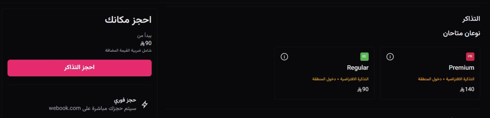 _ تذكرة Premium: تشمل التذكرة الافتراضية ودخول المنطقة مع طاولة ورؤية مميزة، بسعر 140 ريال سعودي. وتقدم هذه التذكرة للحضور تجربة راقية ومريحة مع إمكانية الاستمتاع بالعرض من أفضل الأماكن في المسرح.