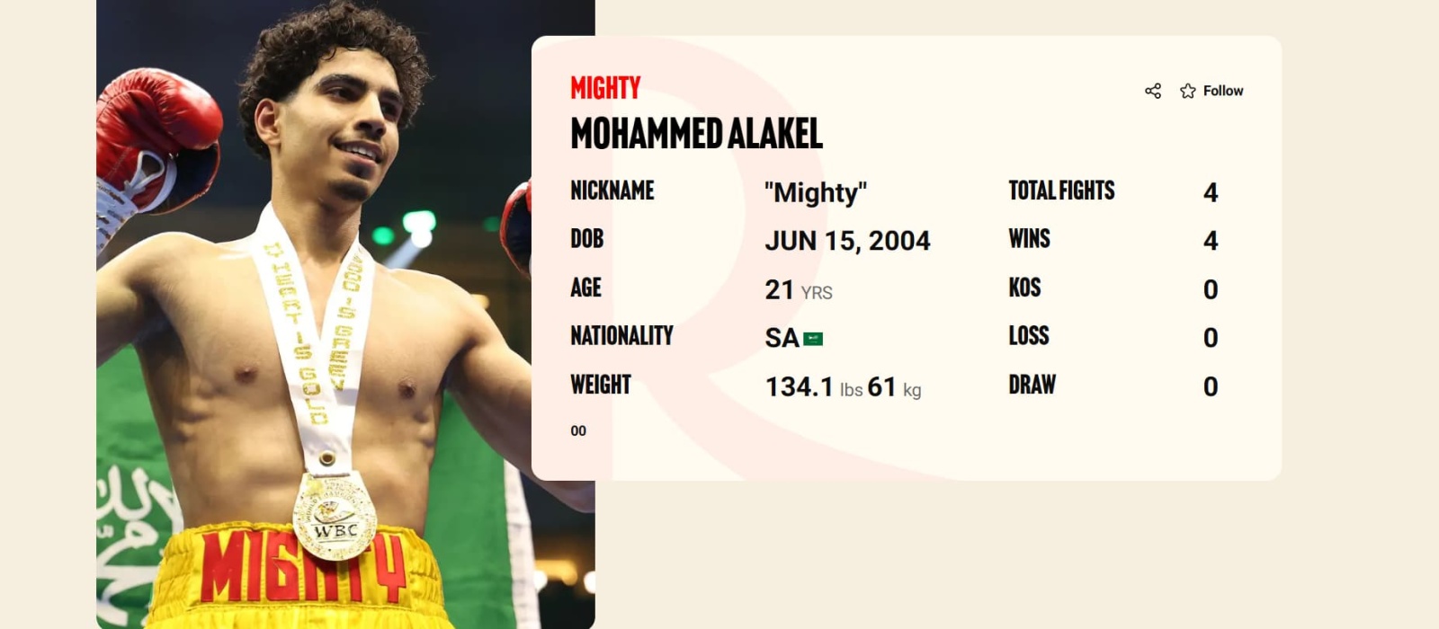 وبين دعم جماهيره، وخبرة مدربيه، وتشجيع وطنه، يبدو أن "Mighty" يسير بخطوات ثابتة نحو أن يكون أحد أبرز الوجوه العربية على الساحة العالمية في رياضة الملاكمة.