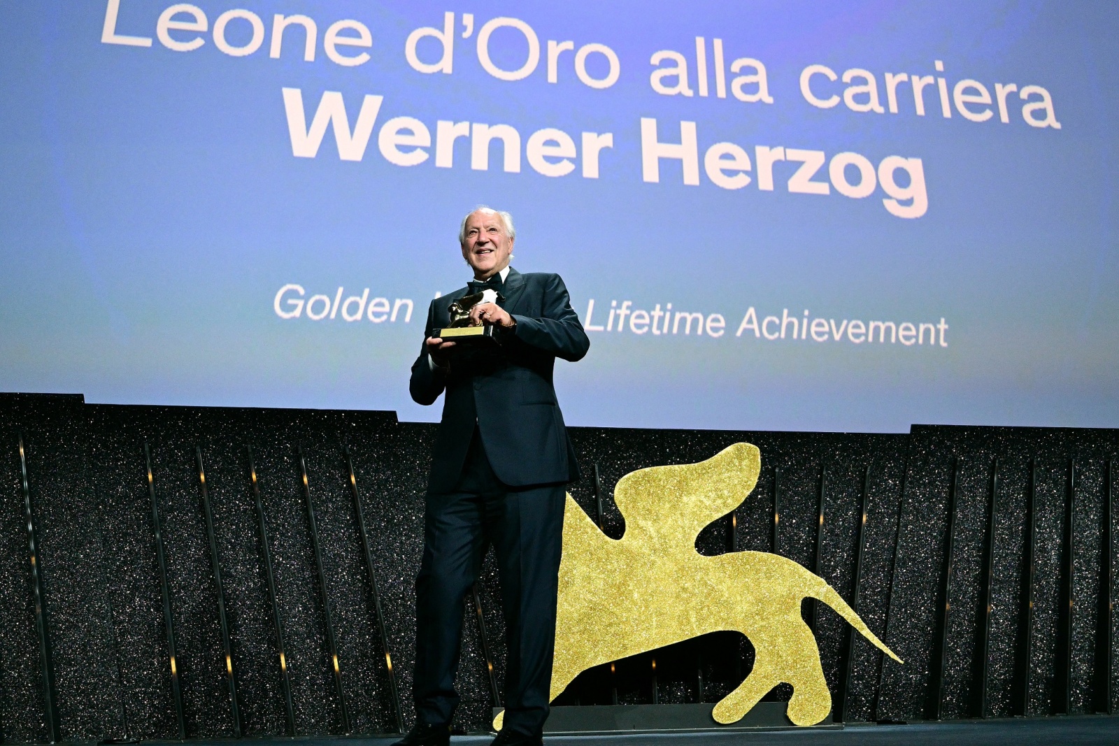 حصل المخرج الألماني الشهير فيرنر هيرتزوغ على جائزة الأسد الذهبي لإنجاز العمر، تقديراً لمسيرة فنية تمتد لأكثر من نصف قرن، وحرص على تسلم جائزته وهو يرتدي بدلة كلاسيكية أنيقة باللون الأسود، مع قميص باللون الأبيض.