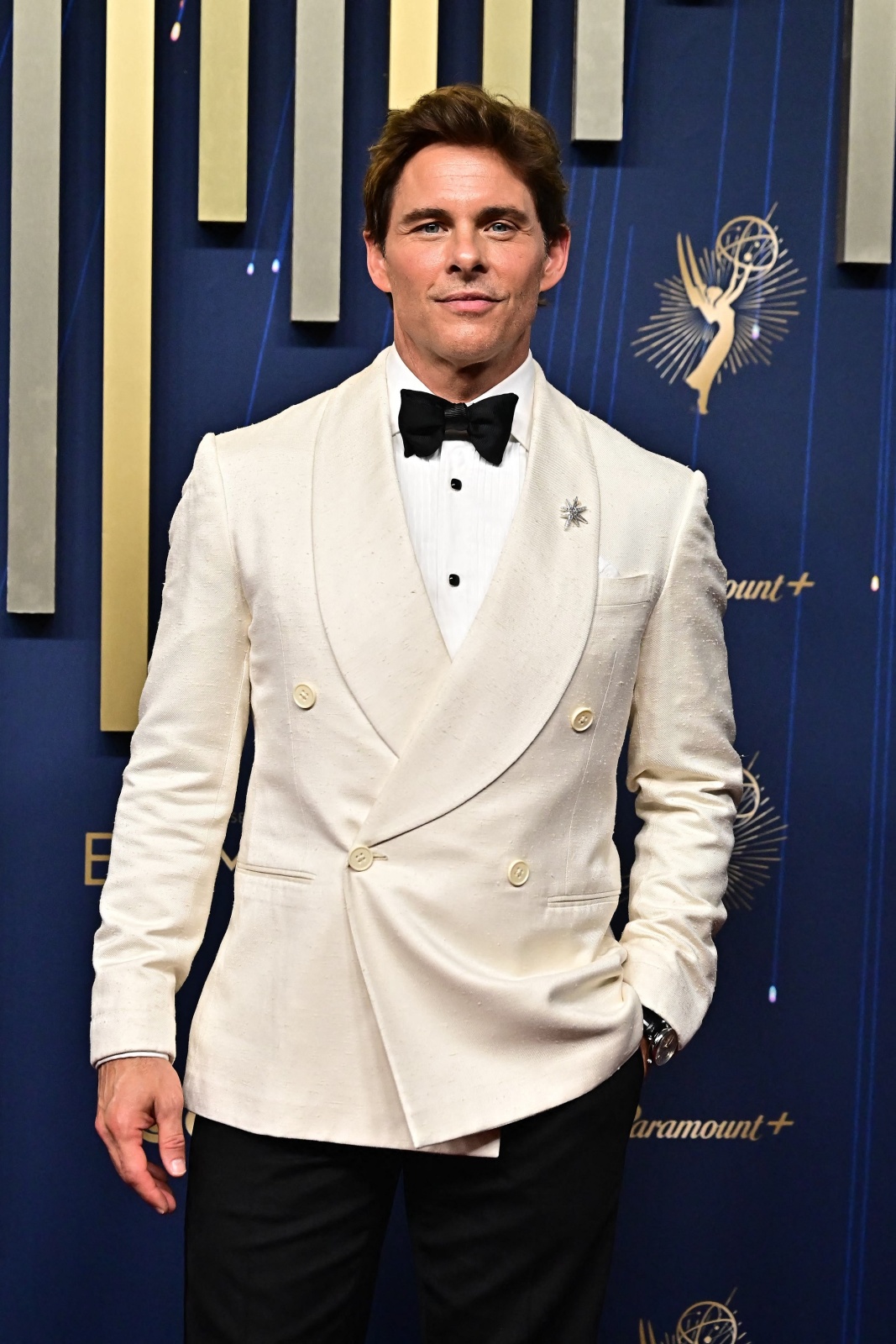 أطل النجم جيمس ماردسن ببدلة توكسيدو أنيقة مميزة، بسترة بيضاء بصفي أزرار، مع قميص أبيض بأزرار سوداء وربطة عنق وسروال أسود اللون، وزين البدلة بإكسسوار ماسي على ياقة السترة.