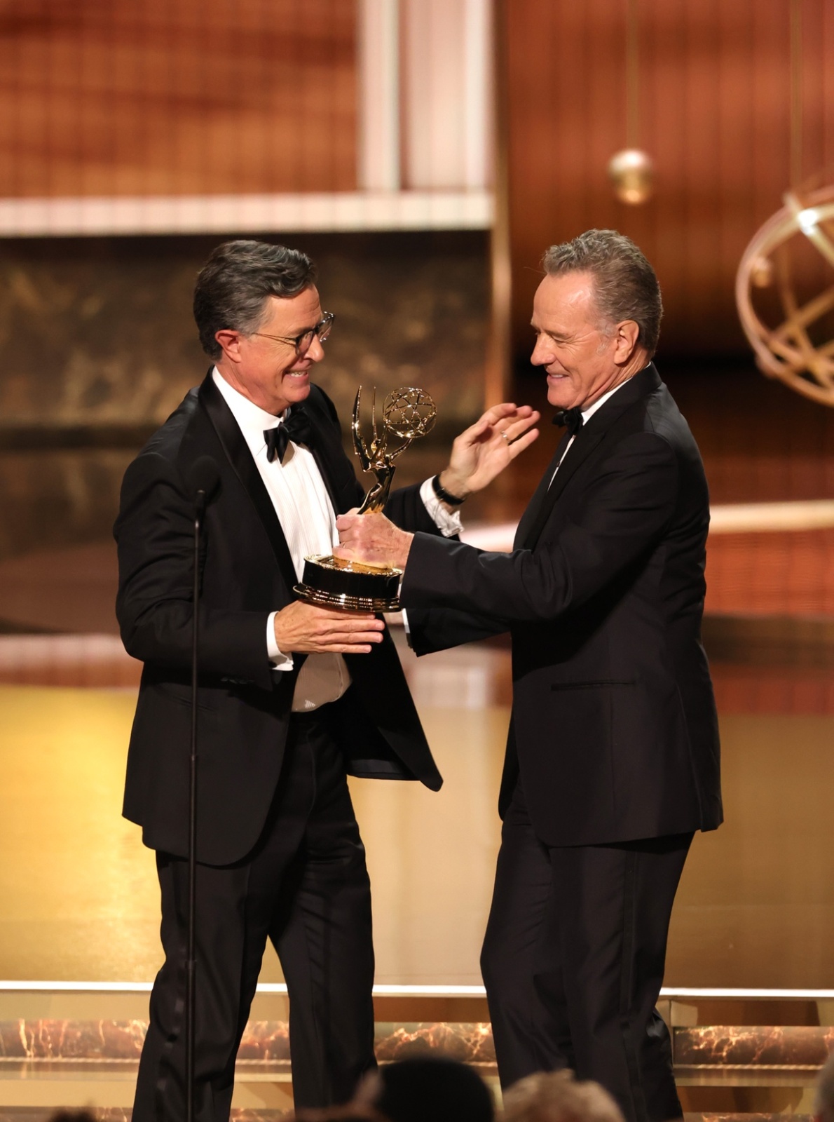 ارتدى بريان كرانستون بدلة رسمية من الصوف والحرير الأسود من "زينيا Zegna"، وقميصًا حريريًا أبيض، وربطة عنق حريرية سوداء، وحذاءً مسائيًا من الجلد الأسود من "فيينا Vienna"، أثناء تسليمه الجائزة لستيفن كولبير عن سلسلة الحوار المتميزة في برنامج "The Late Show With Stephen Colbert" في مسرح Peacock.