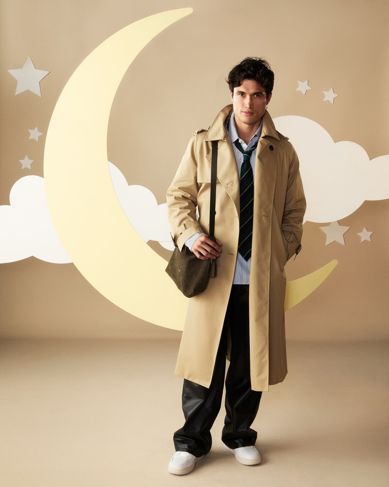حضر عدد كبير من النجوم عرض أزياء العلامة التجارية الشهيرة كوتش، ومن بينهم الممثل الشهير تشارليز ميلتون، الذي ارتدى إطلالة من تصميم الدار الشهيرة بالطبع، وجاءت مكون من ترينش كوت باللون البيج ونسقه مع قميص باللون الأزرق السماوي بخطوط طولية، وتركه خارج السروال التشينو مع رابطة عنق، وحذاء رياضي أبيض اللون.