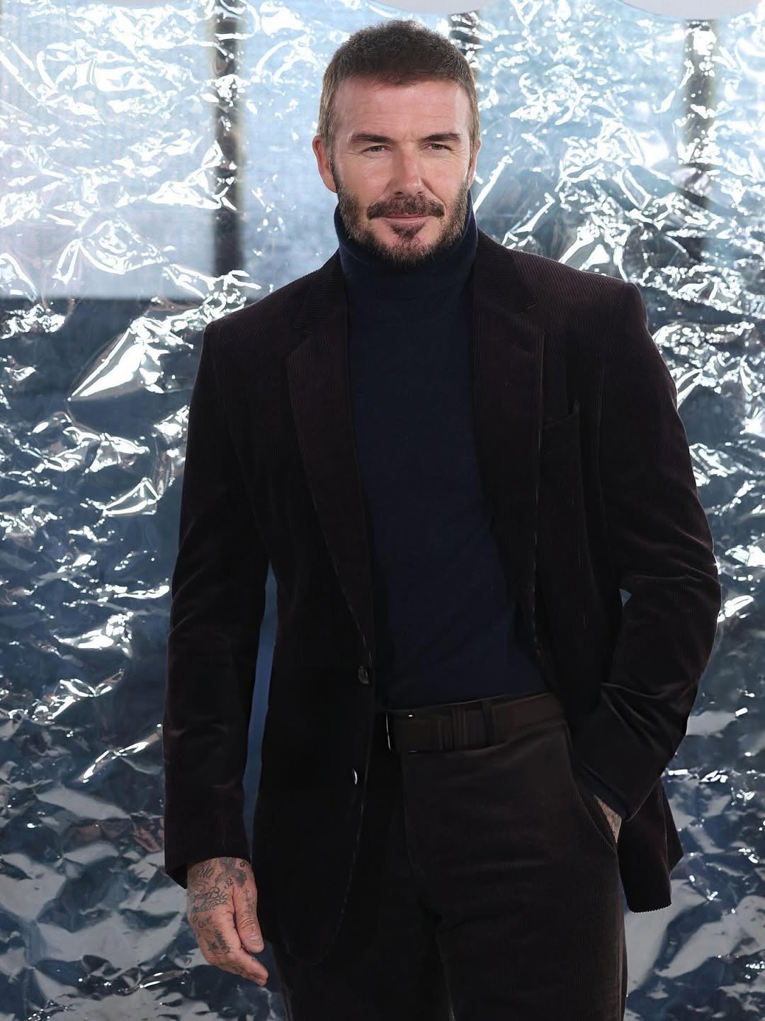 ظهر النجم الإنجليزي ديفيد بيكهام في عرض أزياء العلامة التجارية بوس في أسبوع الموضة في ميلانو مرتديًا بدلة أحادية اللون، وجاءت من خامة المخمل ونسقها مع T-Shirt برقبة عالية باللون الكحلي.