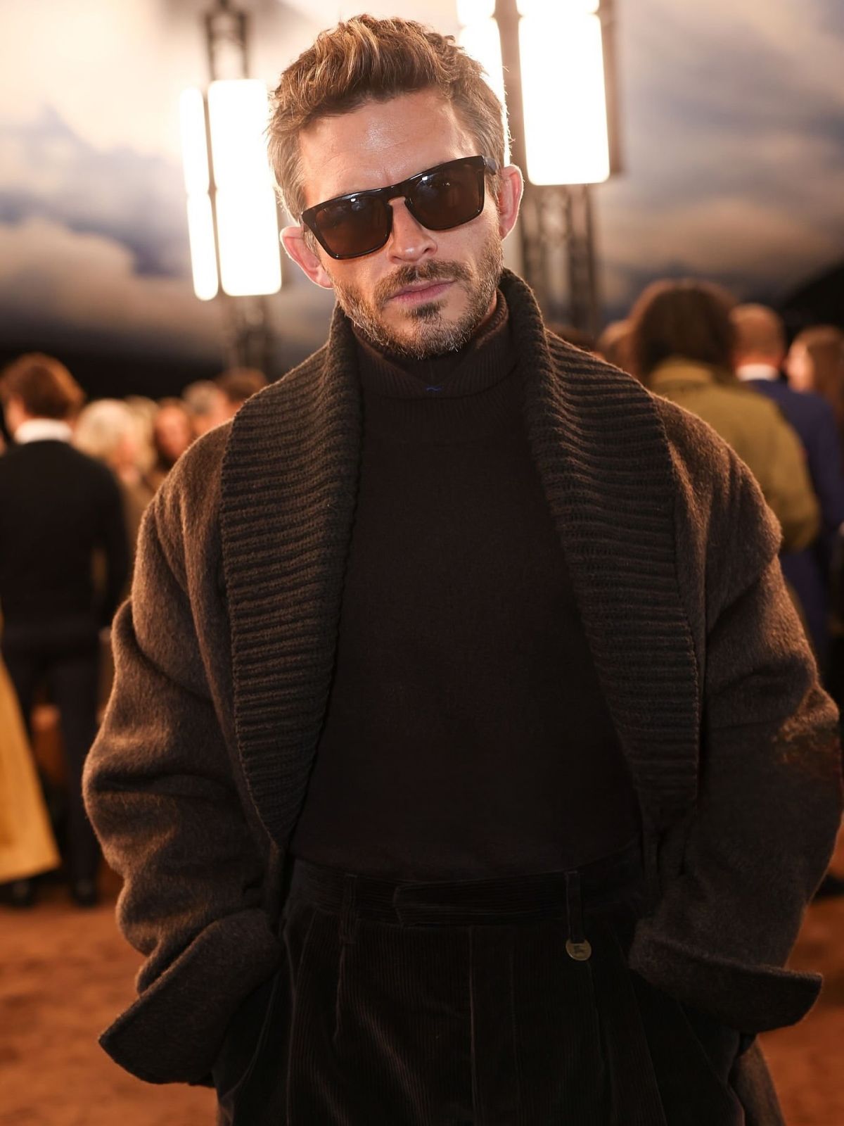 خطف النجم جوناثان بايلي الأنظار في عرض بربري بملابسه الأنيقة باللون البني، ظهر بكنزة صوفية وفوقها كارديجان بياقة وشاح بتصميم واسع وسروال واسع، ليظهر بأناقة ملفتة.