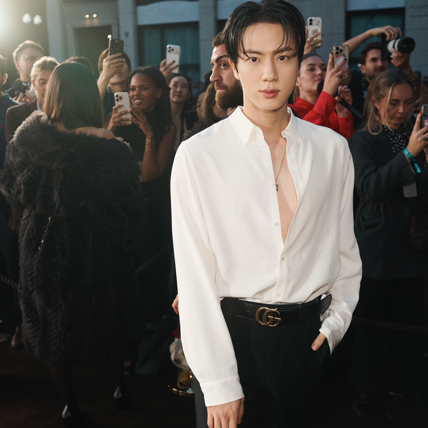 تواجد المغني الكوري الجنوبي جين، عضور فريق BTS في عرض أزياء دار جوتشي، واختار إطلالة كلاسيكية بسيطة من قميص أبيض وسروال أسود، وتزين بحزام الدار الشهير ذي شعار الـGG.