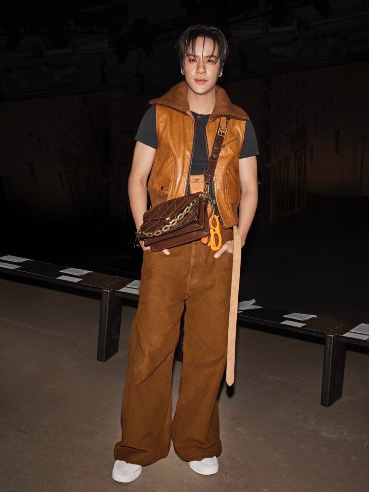 تواجد الممثل والمغني التايلندي كورابات كيردبان الشهير بـ"نانون" في عرض العلامة التجارية كوتش، مرتديًا إطلالة كاجوال مميزة مكونة من صديري من الجلد بياقة كبيرة من الصوف المحيوك بلون بني مع سروال من الخامة واللون نفسيهما، ونسقهما مع تي شيرت رمادي اللون.