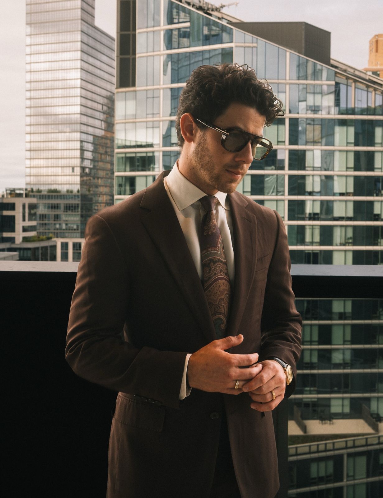 اختار نيك جوناس بدلة كلاسيكية باللون البني المحمر، ونسقها بأناقة مع رابطة عنق ملونة تطابق أزياء زوجته بريانكا تشوبرا، مع قميص أبيض.