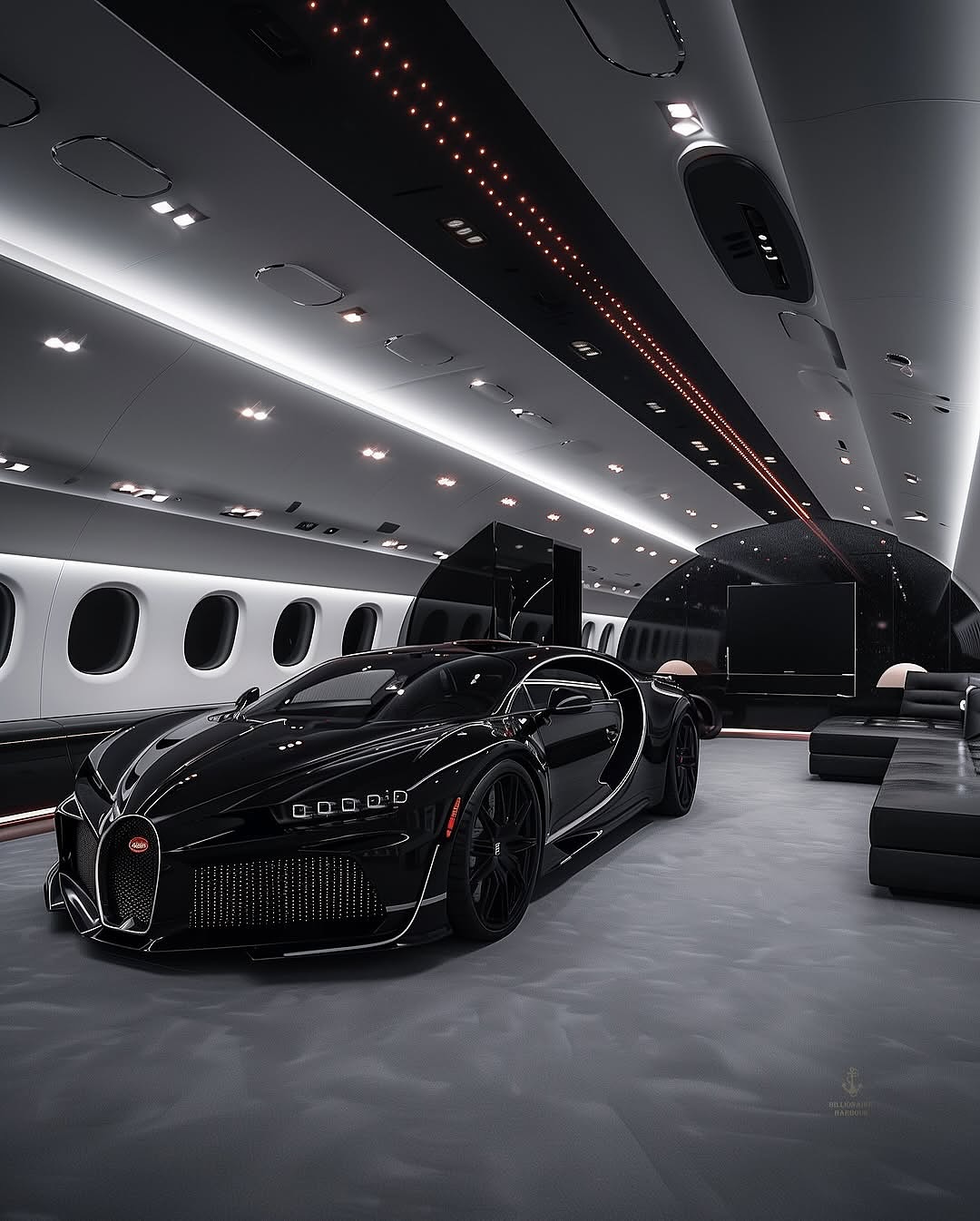 منصة عرض فريدة تضم سيارة بوغاتي حقيقية تُعرض داخل الطائرة على ارتفاع شاهق.