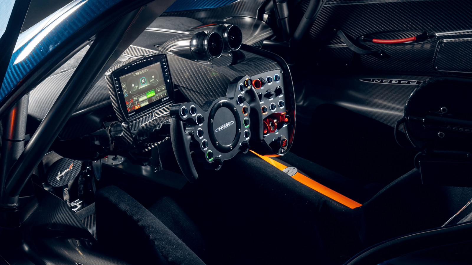أما المقصورة، فتمزج بين الطابع السباقي البحت والفن التصميمي الفريد الذي تشتهر به Pagani؛ إذ تحتوي على مقعدين من ألياف الكربون مع أحزمة أمان سداسية النقاط، وقفص أمان مدمج ضمن الهيكل الأحادي، إلى جانب شاشات رقمية ومفاتيح تحكم صُنعت بعناية توازي دقة الساعات السويسرية الفاخرة.