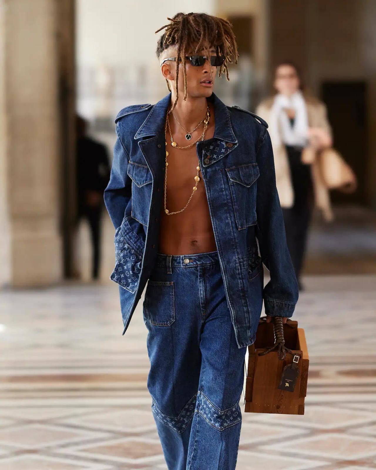 كان جيدن سميث من بين الحاضرين في عرض أزياء دار لويس فيتون، حيث اختار إطلالة دينيم بالكامل. تألق بسترة جينز زرقاء مزينة بشعار الدار وجيوب كبيرة، نسّقها مع سروال جينز بنفس اللون ويحمل الشعار ذاته، لتبرز أناقته الشبابية والمرحة ضمن أجواء العرض.