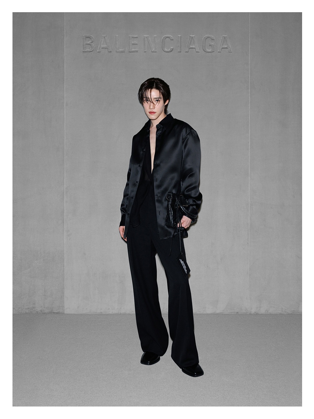 شهد عرض أزياء دار بالنسياغا حضور الممثل والمغني التايلندي كريت أمنويديشكورن بإطلالة رسمية متكاملة باللون الأسود المونوكروم. تألق بسترة من الساتان، نسّقها مع قميص وسروال بنفس اللون، لتبرز أناقته الكلاسيكية مع لمسة عصرية راقية تتناغم مع روح الدار.