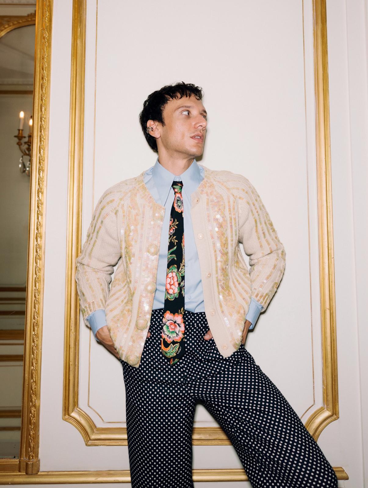 اعتمد المغني الشهير إديس إطلالة عصرية في عرض أزياء فالنتينو، ظهر بكارديجان صوفي بلون ذهبي مطرز بخرز لامع، ترتر، وأزرار كبيرة الحجم، ونسقه مع قميص أزرق سماوي، ورابطة عنق بطباعة زهور ملونة، واختار سروالاً أسود بنقاط بيضاء Polka Dots مع حذاء كلاسيكي أسود.