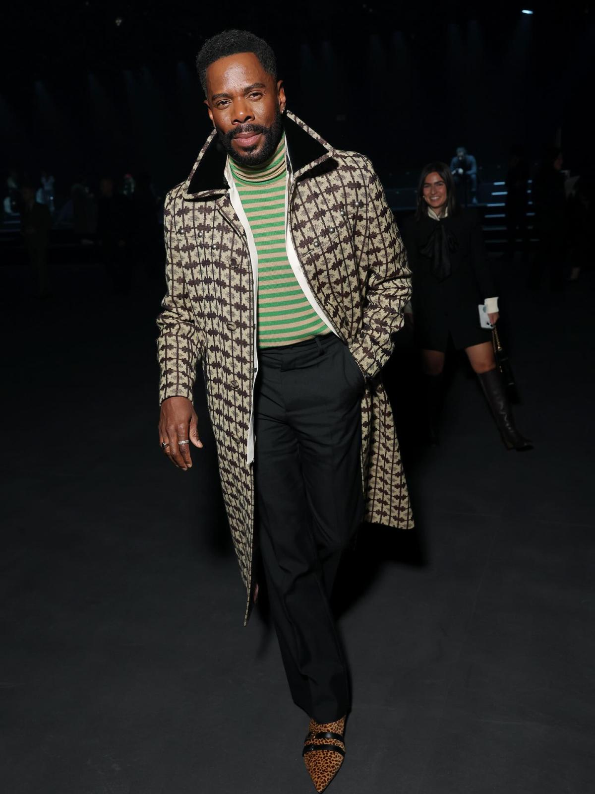وارتدى كولمان دومينجو معطفًا بطباعة أشكال هندسية وتحته كنزة برقبة عالية بخطوط عرضية، ونسقه مع سروال أسود كلاسيكي مع حذاء بطباعة جلد الفهد.