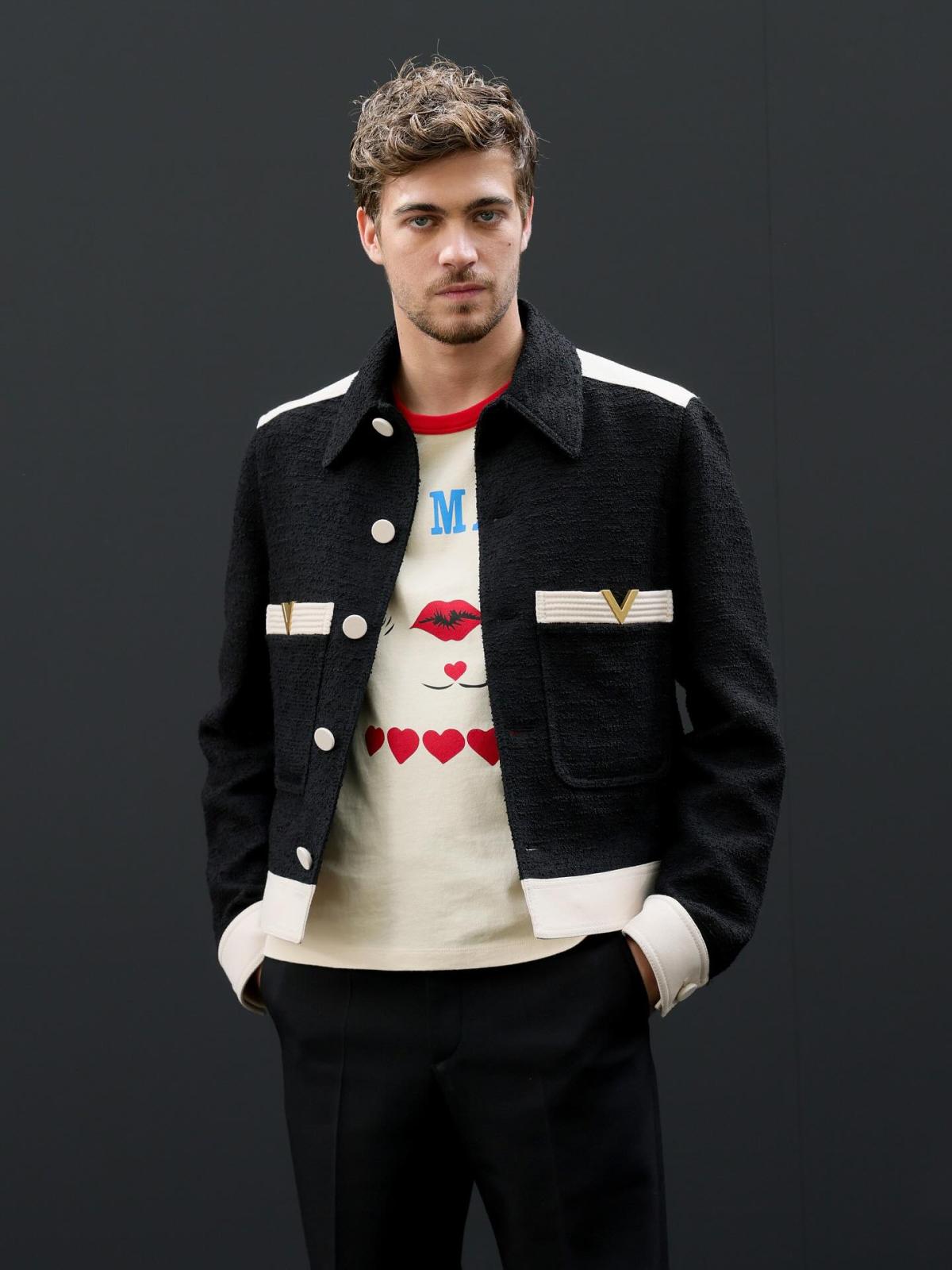 حضر الممثل الإيطالي لورينزو زرزولو في عرض أزياء فالنتينو بإطلالة لافتة من توقيع الدار العريقة. تألق بسترة صوفية قصيرة تتزيّن بحرف V المعدني عند الجيوب، ارتداها فوق تيشيرت مطبوع برسومات قلوب حمراء وشفاه، فيما اختار سروالاً أسود أنيق الشكل أضفى على إطلالته طابعًا رسميًا راقيًا يناسب أجواء العرض.