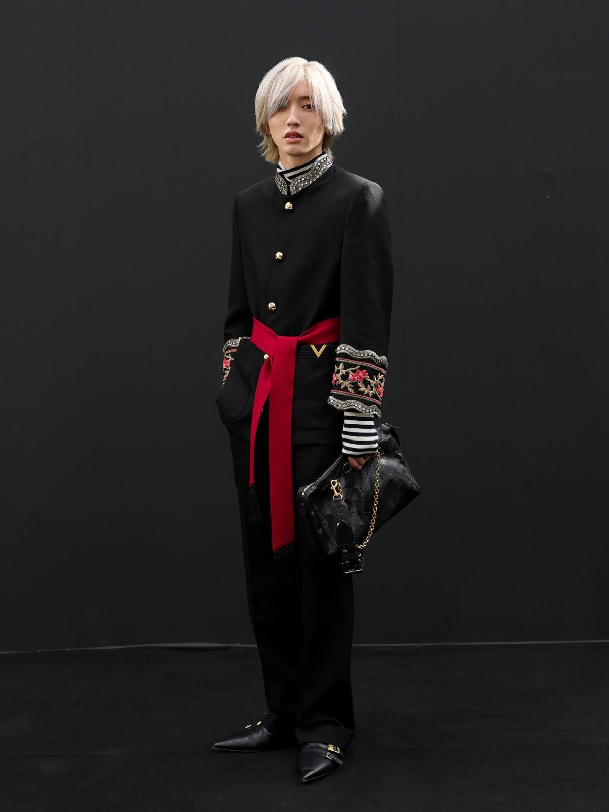 اختار الممثل والمطرب ميشيدا شونسوكي الظهور في عرض أزياء فالنتينو بإطلالة لافتة، مرتديًا معطفًا أسود مزخرفًا بالذهب وورود حمراء وياقة مستقيمة مطرزة، وأكمل الإطلالة بسروال أسود أنيق، ما أضفى عليها لمسة كلاسيكية وجريئة في الوقت عينه.