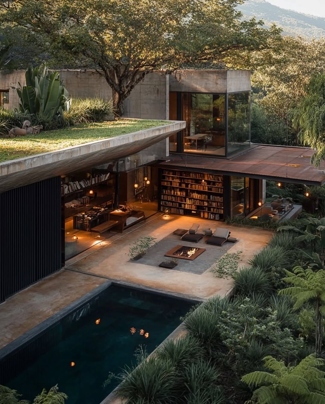 وتضم المساحة مكتبة تمتد بمحاذاة المسبح، وحمامًا مفتوحًا على قمم الأشجار، ما يمنح القاطنين تجربة حسّية تجمع بين الراحة والعزلة في آن واحد.
