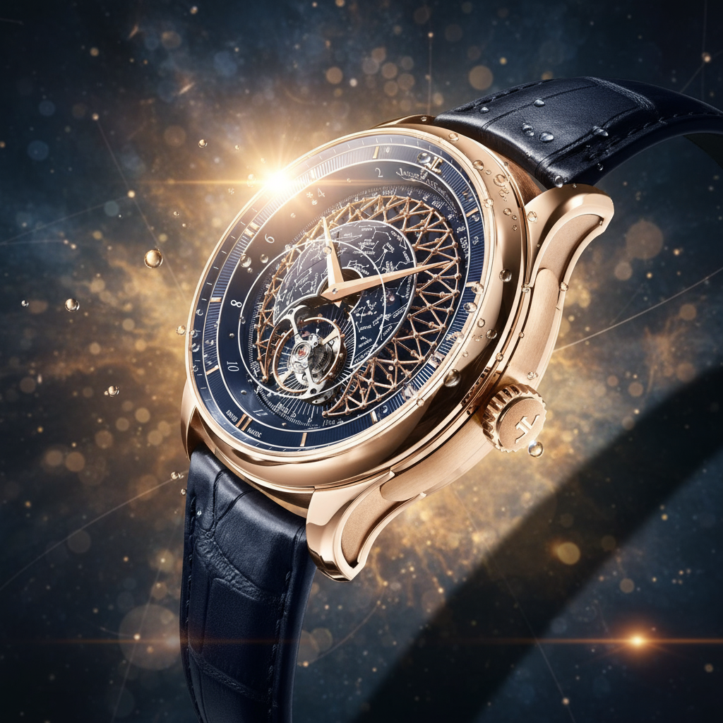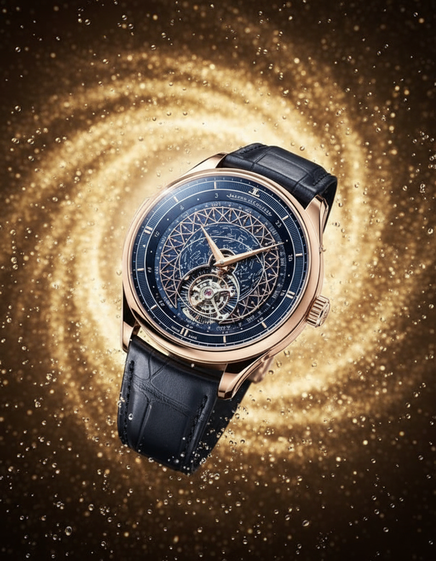 وعلى عكس التوقيت المدني الذي يقيس مدار الأرض حول الشمس، يعرض قرص الساعة المصنوع من مينا شامبلوفيه أزرق داكن كوكبات نصف الكرة الشمالي كما تُرى من وادي جو في سويسرا، مقر شركة جيجر لوكولتر. يغطي هذا القرص هيكلاً معدنيًا ذهبي اللون مزخرف، مصنوع من 117 كرة مترابطة تحاكي بدقة خطوط الكوكبات السماوية، ليحوّل كل لحظة إلى رحلة فلكية دقيقة بين النجوم.