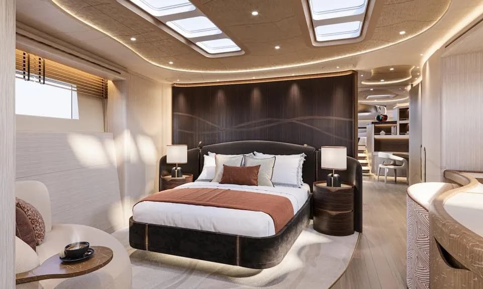 تُغمر الصالة الرئيسية في الطابق السفلي بضوء طبيعي وفير بفضل النوافذ الواسعة التي توفر اتصالًا مباشرًا مع أجواء البحر. أما جناح المالك، فيتميز بلوحٍ رأسي من الجلد المصنوع يدويًا بتوقيع Foglizzo & Winch Design، وسقفٍ مستوحى من حركة الأمواج يتكامل مع فتحة سماوية تُطل مباشرة على الأشرعة، ما يمنح الإقامة إحساسًا بالانغماس في تجربة الإبحار نفسها.