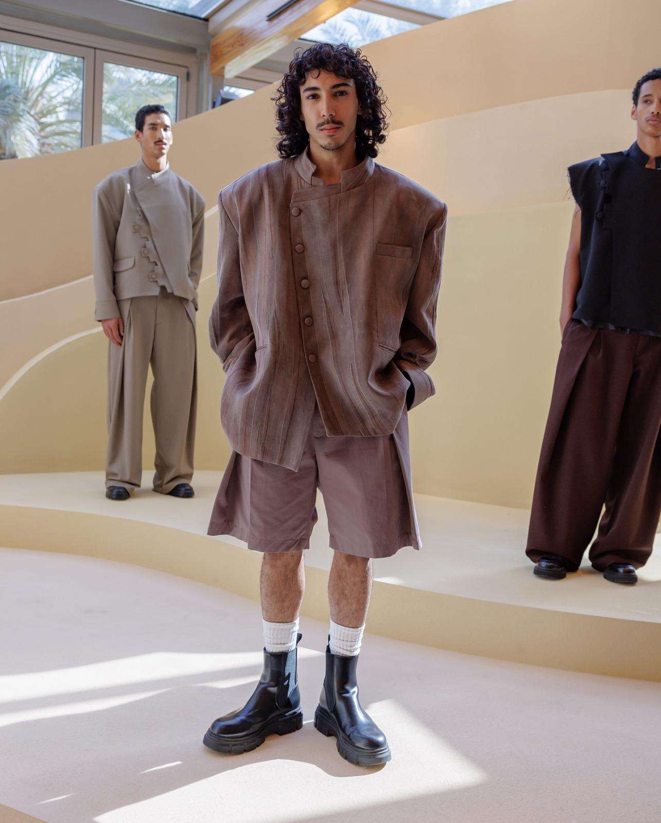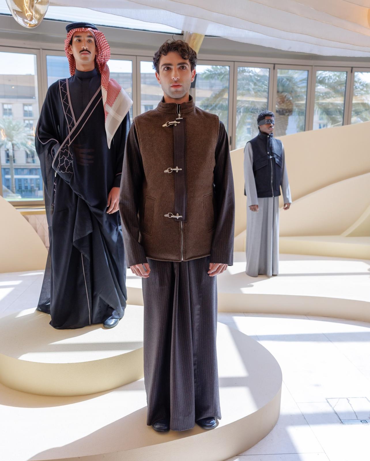 ومن أبرز القطع في المجموعة كانت البدلة الرسمية بلا أكمام المنسقة مع قميص ورابطة عنق، وجمعت بين الطابع الكلاسيكي القديم المستوحى من أزياء الآباء والأجداد وتصميم عصري جريء يناسب أبناء الصحراء اليوم.