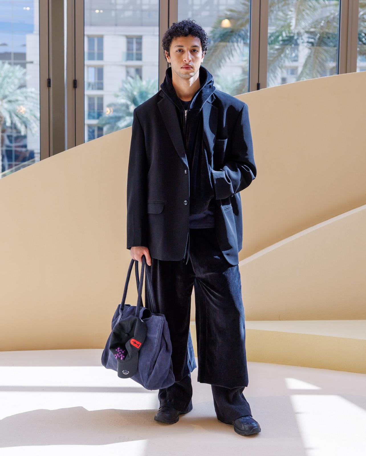 ظهرت البدلة الرسمية بلمسة جريئة مستوحاة من الستايل الياباني، واعتمدت المجموعة على ألوان حيادية مثل الأبيض والأسود، مع استخدام متكرر للدنيم والجلد.