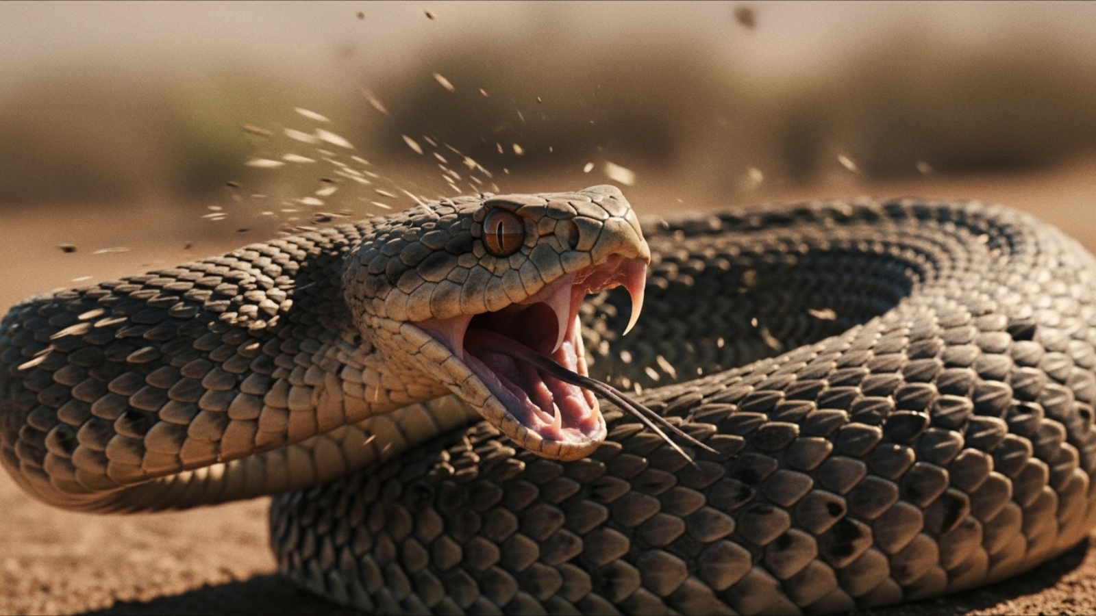العضّ السريع والدقيق — حيث تهاجم الأفعى وتغرس أنيابها خلال 0.1 ثانية فقط، أسرع من قدرة معظم الثدييات على رد الفعل.