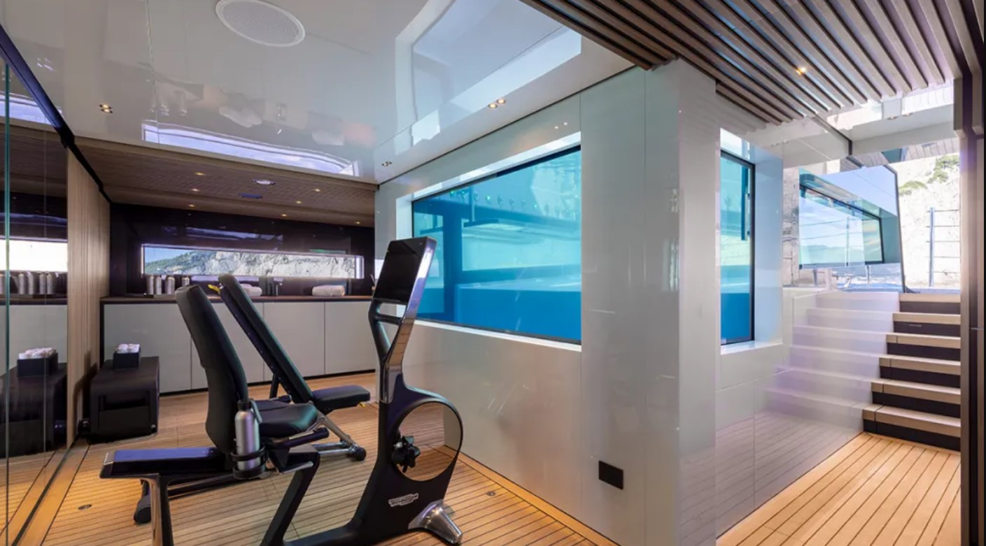 هذا المسبح يشكل عنصرًا هيكليًا في اليخت بفضل جدرانه الزجاجية التي تضفي إضاءة طبيعية على نادي الشاطئ الواقع في الطابق السفلي، والذي يمكن الوصول إليه عبر أبواب هيدروليكية من جانبين اليخت