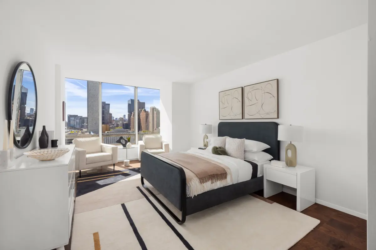 الشقة تفتح على ردهة فسيحة تؤدي إلى غرفة معيشة زاوية، تطل على نهر إيست ريفر ومبنى الأمم المتحدة، كما تضم جناحًا رئيسيًا بثلاث خزائن، إحداها بتصميم غرفة ملابس فسيحة، إلى جانب غرفة طعام وحجرة يمكن استخدامها كمكتب منزلي.
