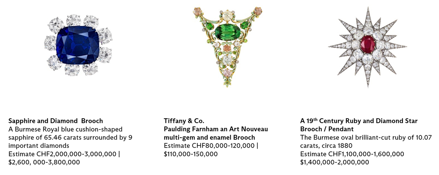 تضمنت القطع المجوهرات الراقية دبوس من الياقوت الأزرق الملكي البورمي الذي يزن أكثر من 65 قيراطًا، إضافة إلى دبوس نجمة ياقوت بورمي بوزن 10.07 قيراط, كما تضم القطع الرائعة دبوس زهري على طراز الفن الجديد (آرت نوفو) من تصميم الفنان بولدينج فارنهام لصالح دار تيفاني، وسوار آرت ديكو مزين بالألماس والأحجار الكريمة من توقيع «لاكلوش فرير»، والذي يعد من روائع التصميم الأوروبي الحديث في عشرينيات القرن الماضي.
