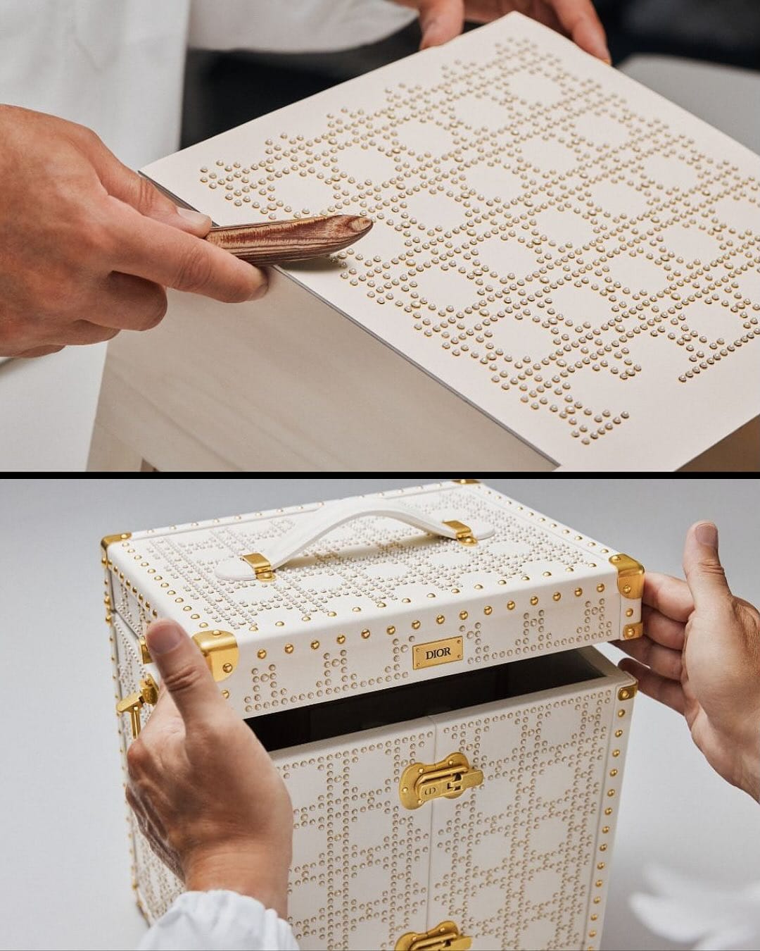 تم تصنيع حقيبة La Malle L'Or de Vie يدويًا من جلد العجل الإيطالي الفاخر وخشب الحور الراقي، وتتميز بتفاصيل دقيقة للغاية، حيث تتألق بأكثر من 5000 لؤلؤة بيضاء، تم تثبيتها بشكل معقد باستخدام نمط Cannage الشهير، وهو أحد أبرز معالم دار ديور.