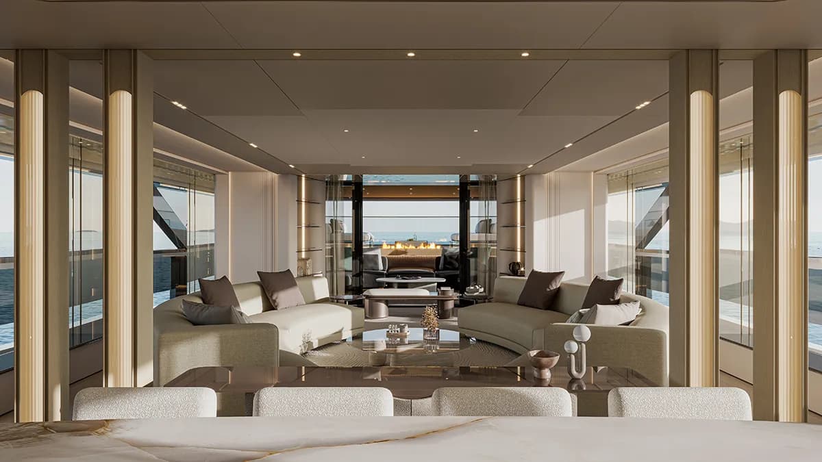 يُعد القسم الخلفي من اليخت واحدًا من أبرز عناصره الجمالية، حيث يضم سطحًا شبه علوي على شكل "ميزانين" يرتفع بنحو 35 بوصة عن السطح الرئيسي، خلف مدفأة منحوتة ومعاصرة توفر أجواء استرخاء فريدة.