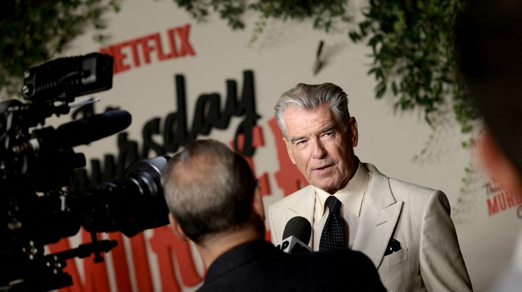 بروسنان، البالغ من العمر 72 عامًا، بدا سعيدًا وهو يغادر المطعم مرتديًا سترة سوداء، بينما التُقطت له صور وهو يبتسم برفقة ابنيه.