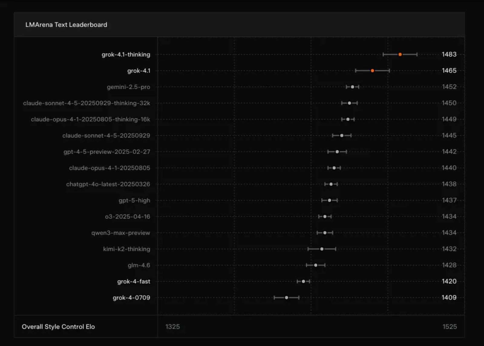 تصدّر Grok 4.1 قائمة متصدري النصوص على منصة LMArena بنتيجة أولية 1483، ما يضعه في صدارة روبوتات المحادثة من حيث تفضيل المستخدمين لجودة الردود مقارنة بالمنافسين.