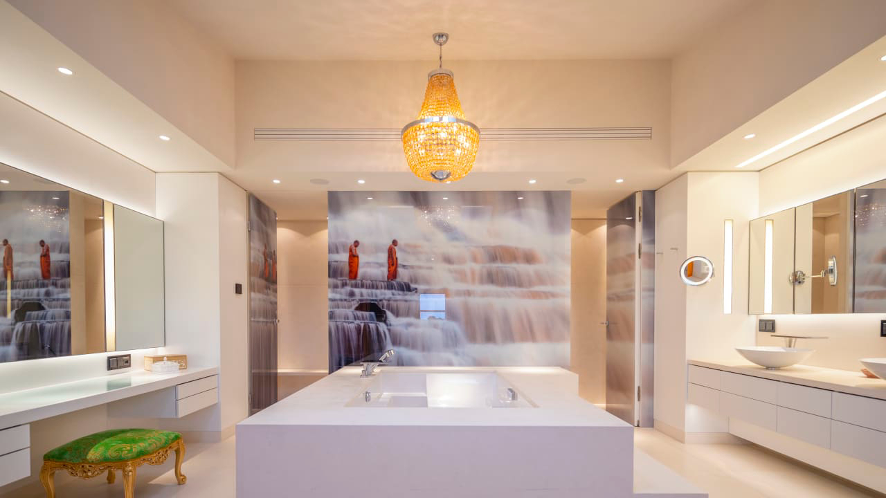 وتمتاز الحدائق المصممة بعناية حول الفيلا بأشكال هندسية وزهور من الأعلى، وتحتوي على مسبح كبير مزين برسومات فسيفسائية.
