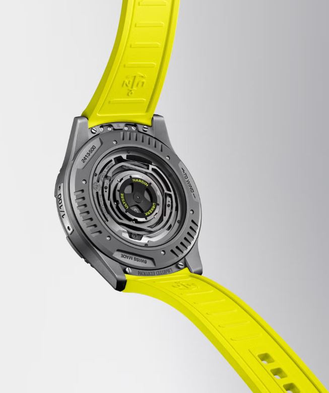 تأتي UR-FREAK بعلبة من التيتانيوم بقياس 44 مم، مع تفاصيل صفراء مضيئة تمنحها حضورًا بصريًا قويًا، كما أن تصميمها الخالي من التاج يعزز الطابع غير النمطي للساعة، ويوحي مباشرة بأن ما بين يديك ليس ساعة عادية، بل قطعة ميكانيكية ذات هوية مركبة ومتطرفة في جرأتها.