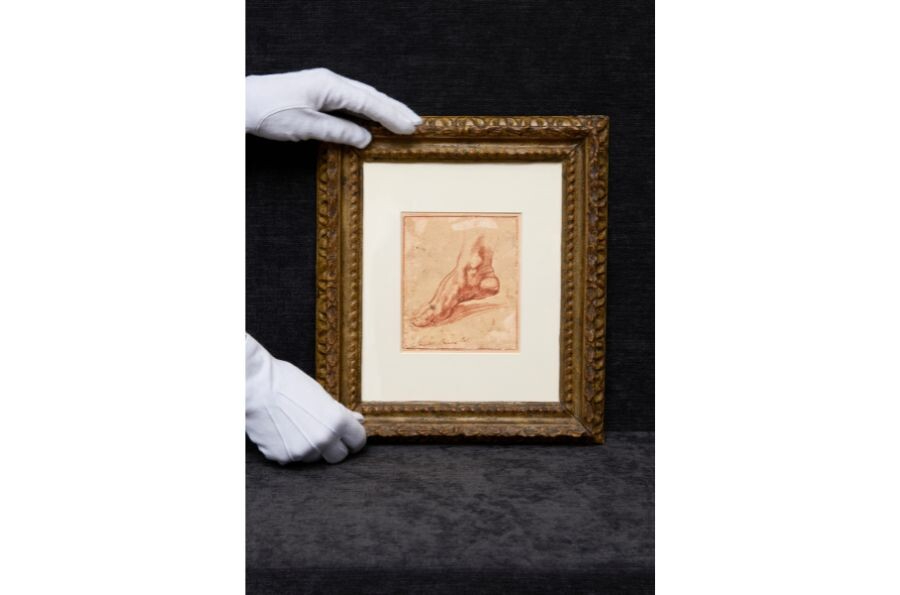 الدراسة بالطباشير الأحمر تُظهر القدم اليمنى لشخصية "العرافة الليبية"، إحدى الشخصيات الشهيرة في جداريات سقف سيستين، وقياسها 13.5 × 11.5 سم، مع توقيع الفنان "مايكل أنجلو بونا روتي".