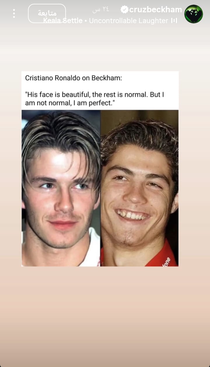 في المقابل، جاء رد كروز بيكهام، ابن ديفيد بيكهام البالغ من العمر 20 عامًا، سريعًا على تصريحات رونالدو، فقد نشر الشاب عبر حسابه الرسمي على "إنستغرام" صورًا تعود لبدايات رونالدو في مانشستر يونايتد عام 2003، إلى جانب صور لوالده في سن مشابهة، مع تعليق مقتضب اعتُبر رسالة سخرية مبطنة، مفادها أن "الجاذبية ليست مجرد مظهر، بل أسلوب وحضور".
